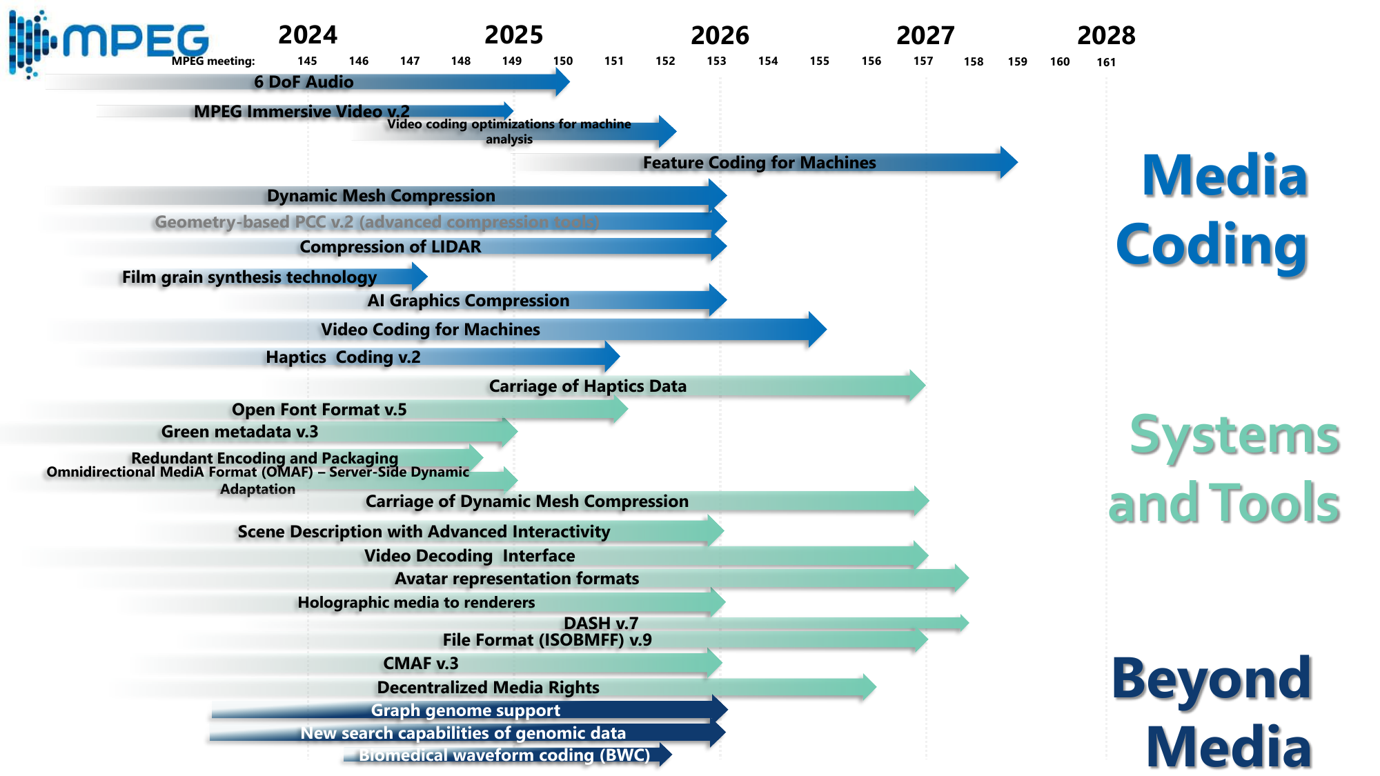 The following well-known MPEG standards give a short overview of the impressive and industry-wide established media standards MPEG is know for: